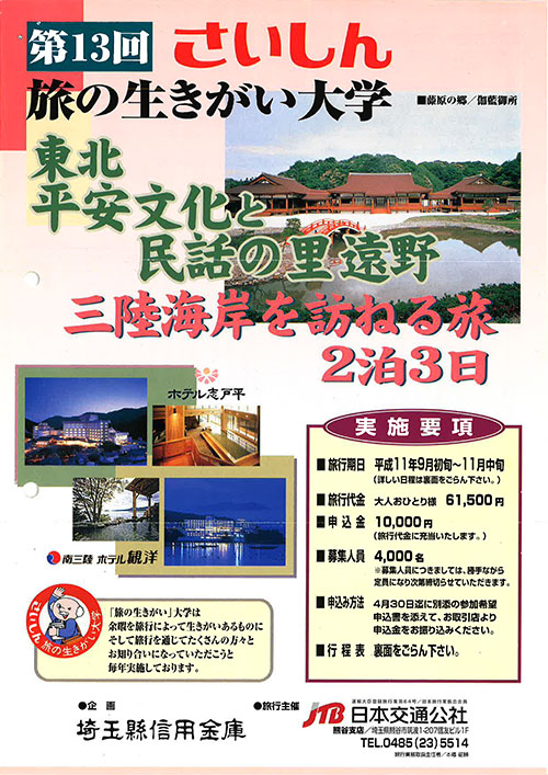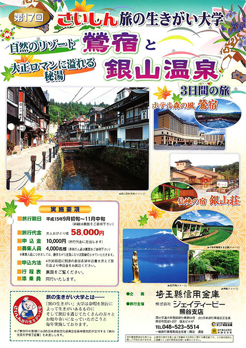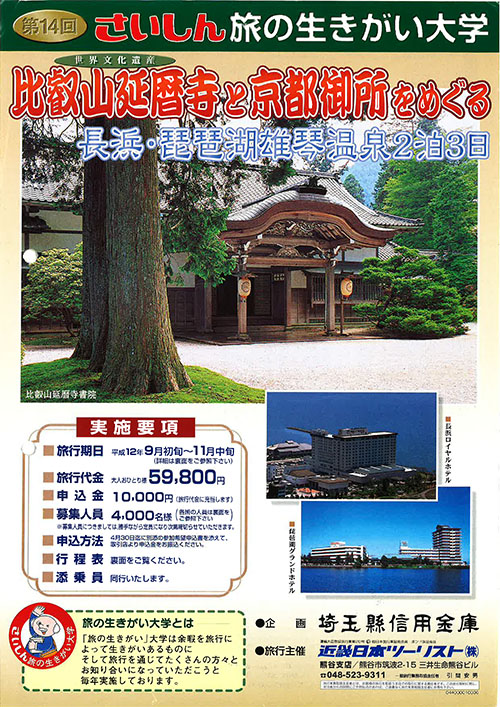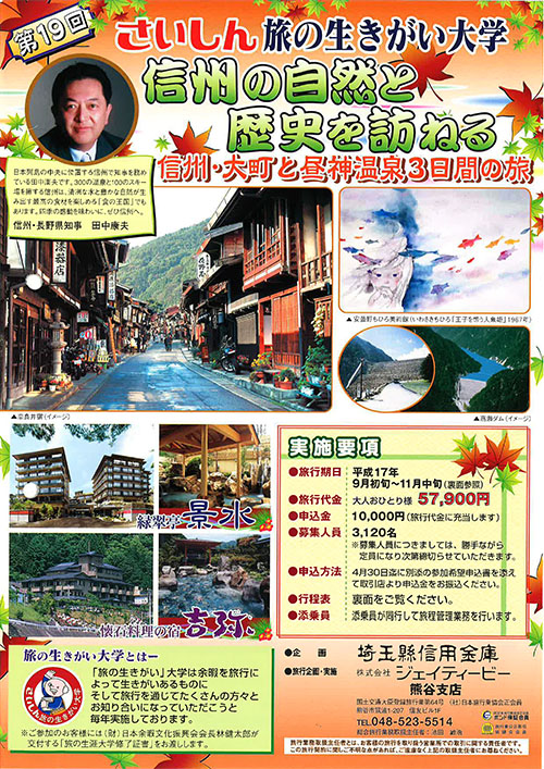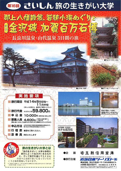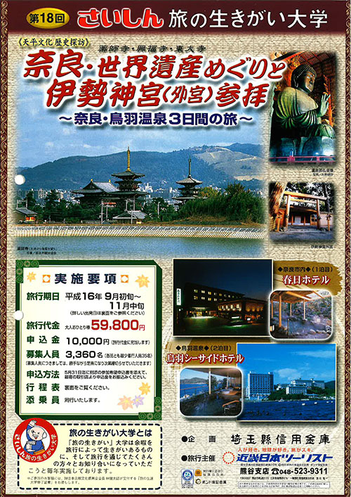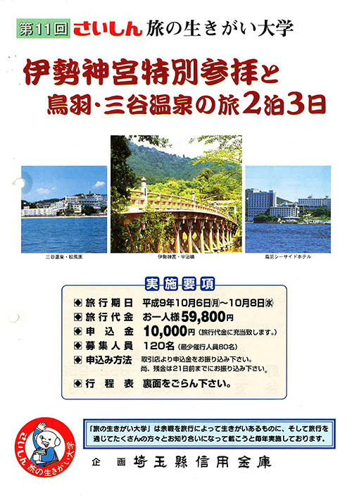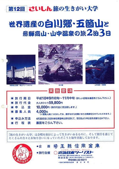 さいしんは昭和62年から、余暇を旅行によって“生きがい”あるものに、そして旅行を通じてたくさんの方々とお知り合いになっていただくことを目的に『旅の生きがい大学』を実施しております。